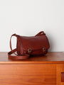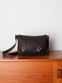 Three-compartment leather shoulder bag with flap closure featuring buckles and hidden snap buttons. Fixed adjustable shoulder strap, hidden front pocket, and rear exterior pocket with zip closure. Cotton lining and antique brass hardware.