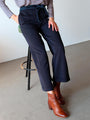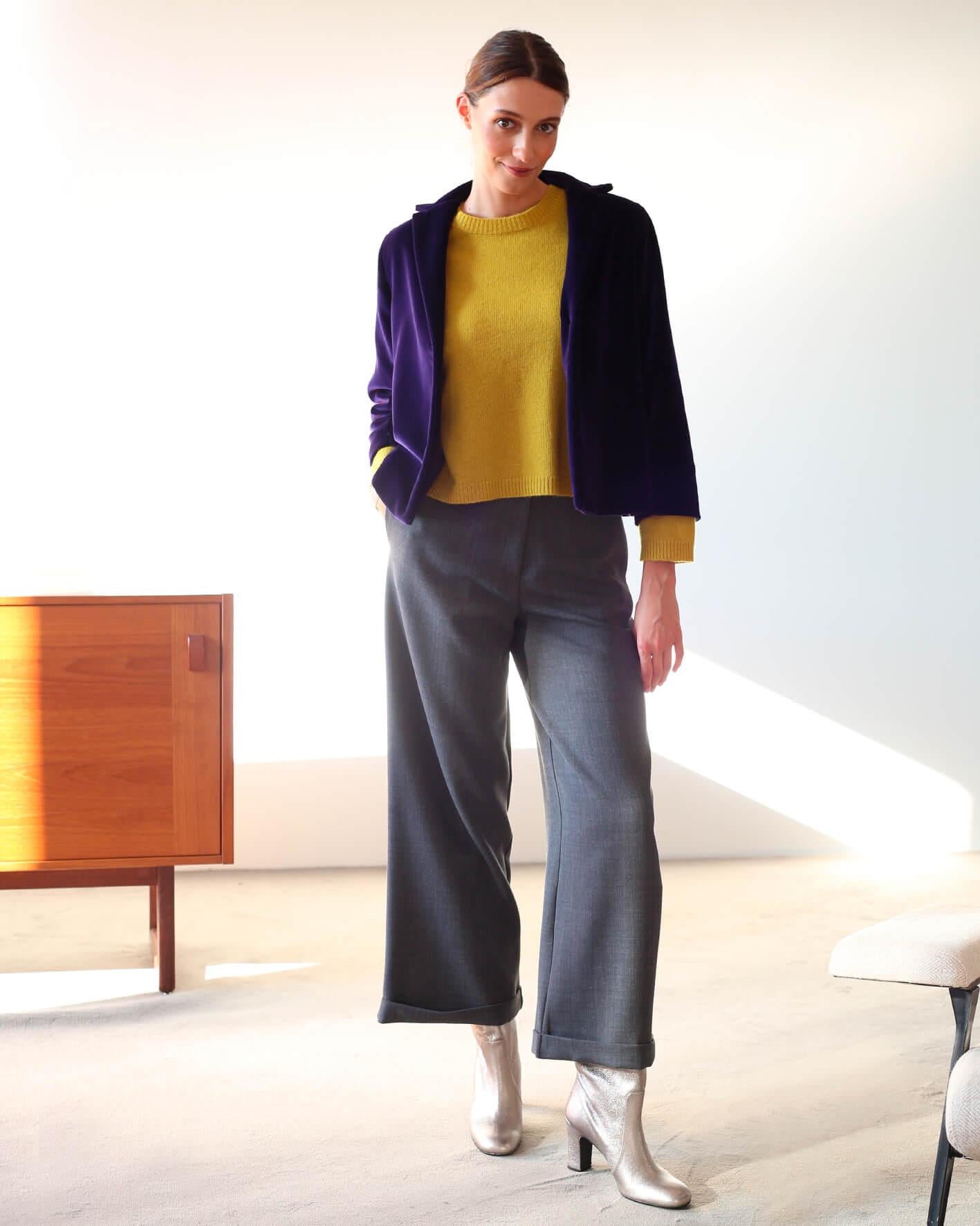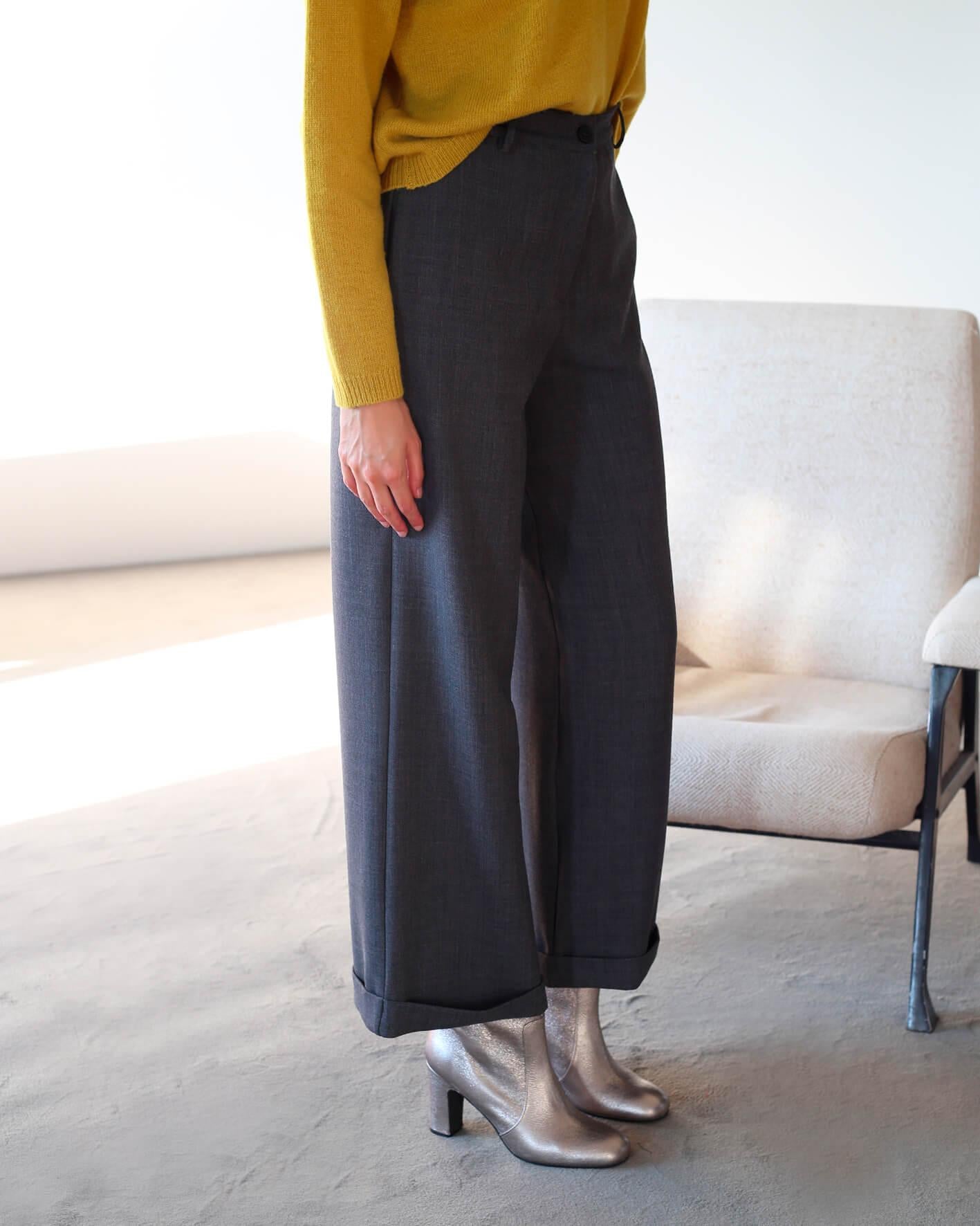 Pantalone lungo a gamba ampia, in lana melange, con pinces sul retro. Passanti per cintura e chiusura con cerniera nascosta e bottone sul davanti.